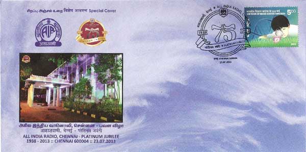 All India Radio (AIR) Chennai, which was inaugurated by the then Chief Minister of composite Madras State C. Rajagopalachary on 16th June 1938, has completed 75 years of existence. It is one of the oldest radio stations in the country. AIR Chennai celebrated its platinum jubilee this year. To mark the occasion, a special cover was released on 23rd July 2013 at Chennai. Release of the special cover coincide with the celebration of 86 years since electricity crackled through the capacitors and amplifiers of the Indian Broadcasting Company’s Bombay transmitter station on July 23, 1927, bringing to life the first radio station in Bombay.