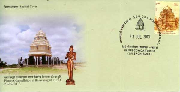 A permanent pictorial cancellation on Kempe Gowda Tower of Bangalore was released on 23rd July 2013 at Bangalore. On the occasion, a special cover was also released. Permanent pictorial Cancellation will be available at Basavanagudi HPO 560 004. Hilda Abraham, Chief Postmaster General, Karnataka Postal Circle, unveiled the pictorial cancellation at function organised at Meghdoot Auditorium, General Post Office, Bangalore. The pictorial cancellation with the Kempe Gowda tower on Lalbagh rock also has geological significance, apart the historical importance attached to it as it was established by the founding father of the city to mark the boundaries of Bangalore. The Lalbagh rock is called the pillow or bubble rock which was formed nearly 3,000 million years ago when a single bubble of lava settled there.