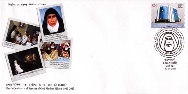 Mother Eliswa was born on 15th October 1831 at Ochanthuruth in Ernakulam District, Kerala. She was a valiant woman who left behind the legacy of a religious culture for women which was unfamiliar in her time - 19th centuries in Kerala. She was not only the foundress of religious congregation but also of the first school for girls, boarding houses, orphanages attached to the school for girl students. It was one of the first women educational reformative movements in Kerala. She was taken to heavenly abode on 18th July 1913 at the age of 82 years. In recognition of her contribution to the society, Kerala Postal Circle released a Special Cover on 28th July 2013 on the occasion of Death Centenary of Servant of God Mother Eliswa (1913-2013) at Edappally.