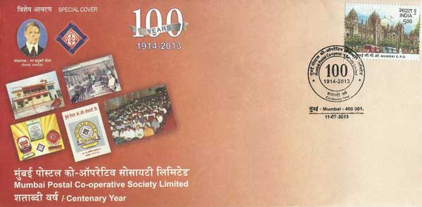 A Special Cover was issued to mark 100 years of Mumbai Postal Co-Operative Society Ltd. on 11th July 2013 at Mumbai. The society was formed in 1914.