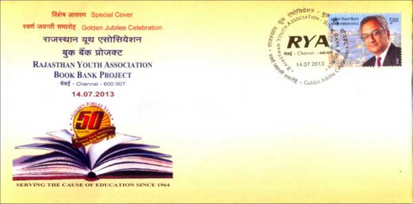 Special cover to commemorate the golden jubilee year of RYA Book Bank was released by Mervin Alexander, Post Master General, Tamil Nadu Circle on 14th July 2013.