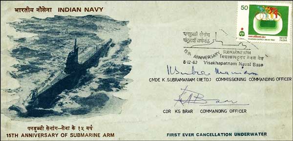 This was the world’s first ever under water Special Cancellation was provided to mark the 15th anniversary of the submarine arm of the Indian Navy on 8th December 1982 (Visakhapatnam Naval Base P.O.) It was a tribute to the Indian Submarines and recognition of their courage, dedication and service in the defence of the country.